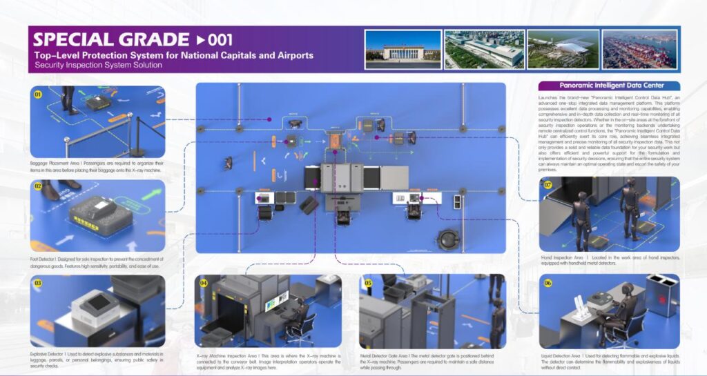 Features: VIP/Passenger/Baggage lanes, non-stop screening, and centralized management with AI-based monitoring and data visualization.